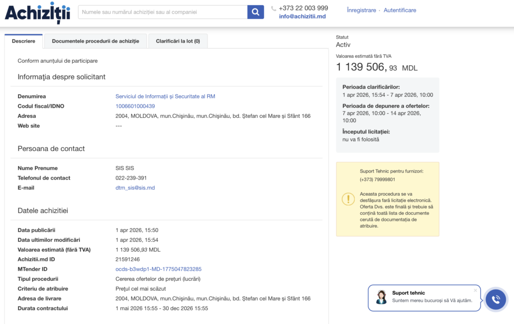 Termenul limită pentru depunerea actelor în cadrul licitației este 14 aprilie, iar durata contractului este stabilită între 1 mai și 31 decembrie 2026.