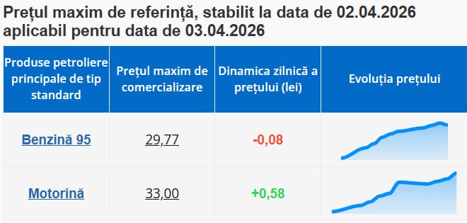 Noile prețuri au fost stabilite pe 2 aprilie și sunt aplicabile pentru ziua următoare, conform mecanismului de ajustare zilnică utilizat de ANRE, care reflectă evoluțiile de pe piețele internaționale.