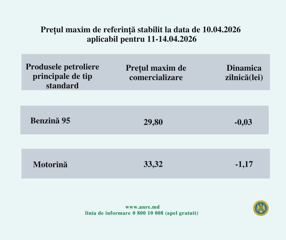 Astfel, pentru perioada 11–14 aprilie 2026, șoferii vor achita maximum 29,80 lei pentru un litru de benzină COR 95, ceea ce reprezintă o scădere de 0,03 lei/litru.