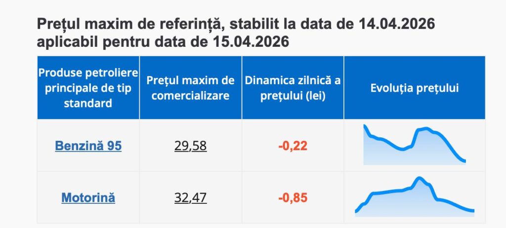 Astfel, pentru ziua de 15 aprilie 2026, prețul maxim de comercializare pentru benzina COR 95 este de 29,58 lei pe litru, în scădere cu 0,22 lei.