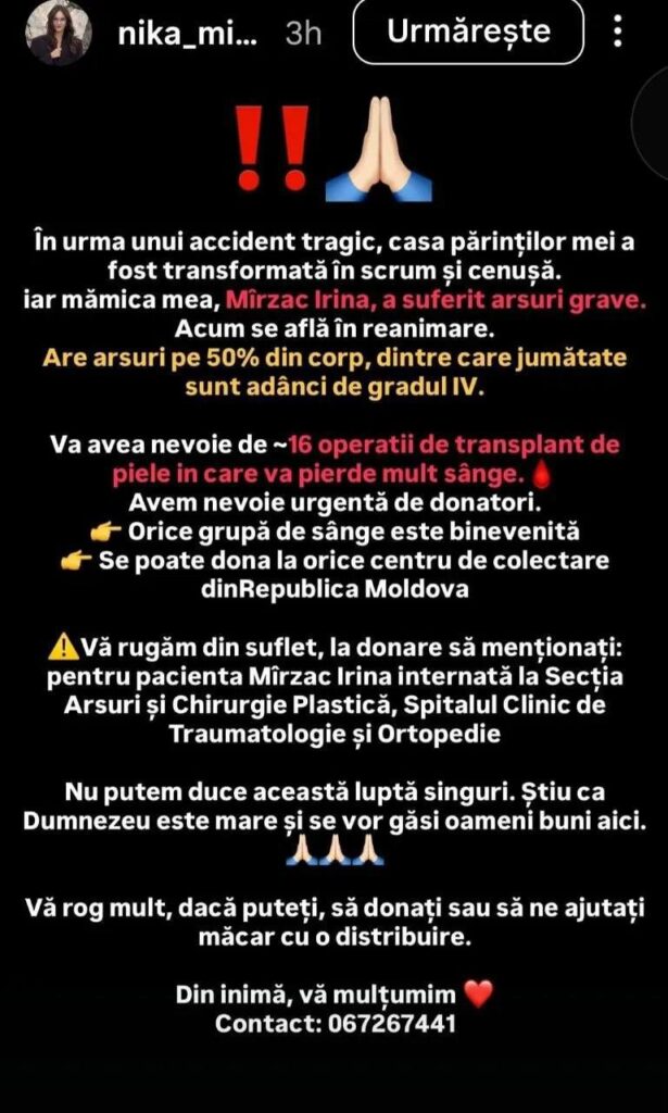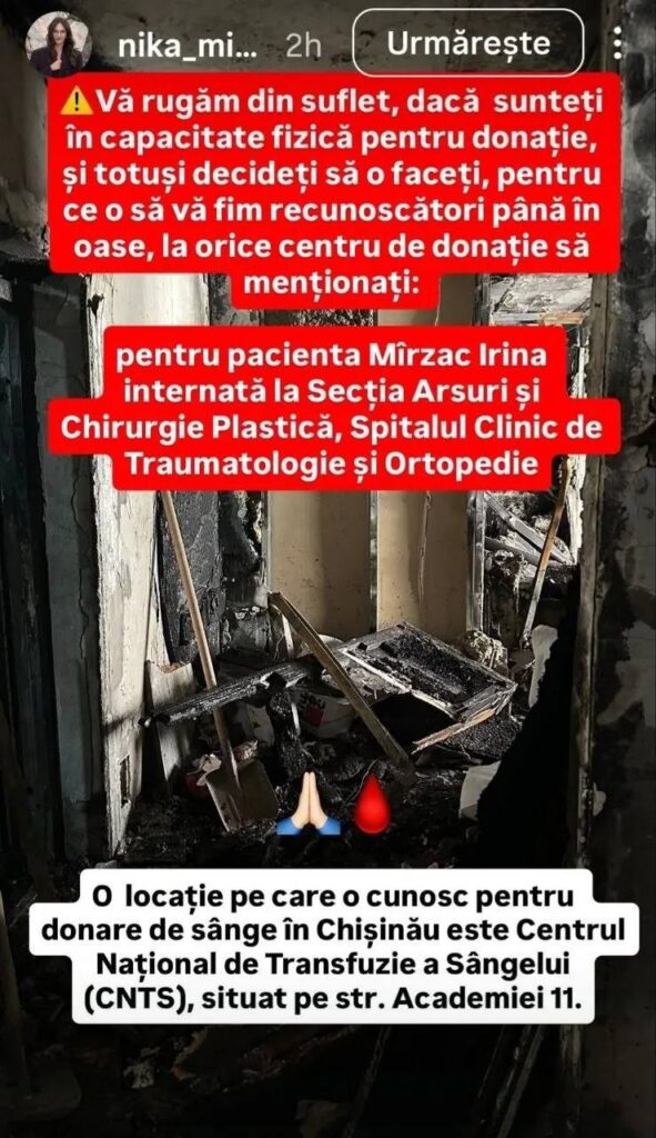Fiica femeii grav rănite în incendiul din 14 aprilie, izbucnit într-un apartament din sectorul Telecentru al capitalei, face apel la cetățeni pentru donare de sânge, în condițiile în care pacienta se află în stare critică.
