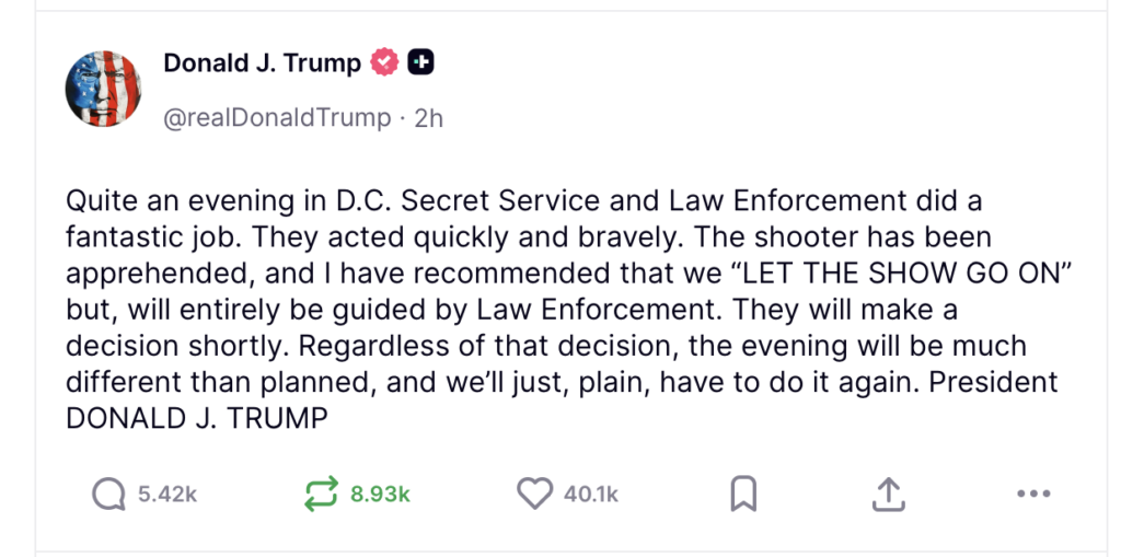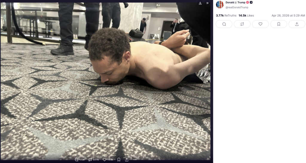 Ulterior, Trump a postat o fotografie pe rețeaua sa de socializare, cu un bărbat încătușat și întins pe covor, care, se pare, ar fi atacatorul.