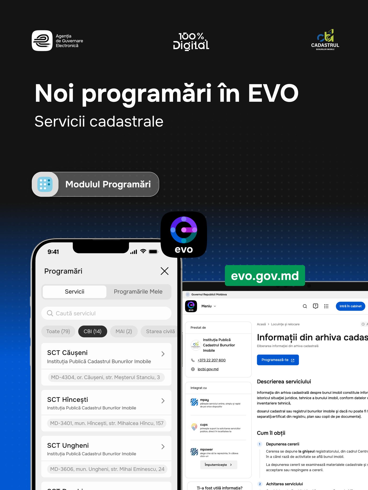 Cetățenii pot face, de acum, programări pentru servicii cadastrale direct din aplicația EVO, prin modulul „Programări”, disponibil în regim pilot în 14 localități din țară.